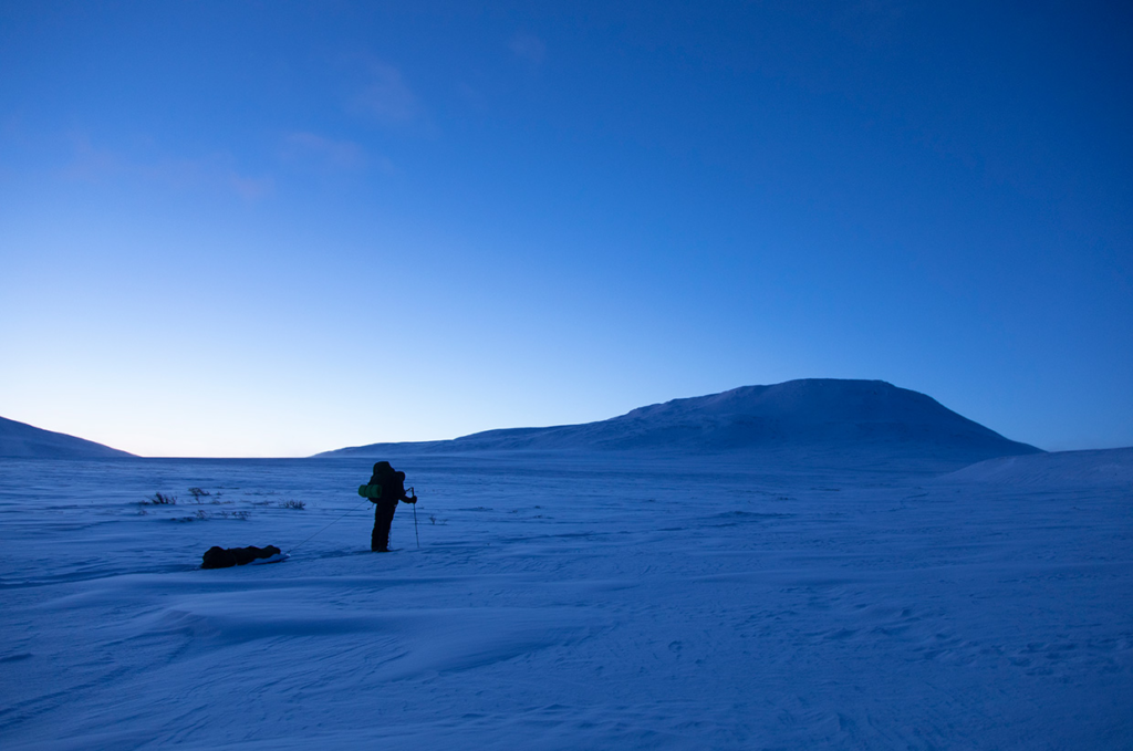 En el fondo del valle, entre los dos picos, hay un lago helado. Debemos cruzar esta vasta extensión blanca con la pulka, pero hacerlo mientras los fantasmas de la montaña nos observan desde arriba sería inútil. Seremos muy visibles sobre el lago cubierto de nieve. Así que esperamos. A que caiga la noche, o a que los animales se alejen de nuestra vista. La luna llena ilumina un paisaje de tranquila serenidad antes de que me sienta seguro para dar el paso. Mientras empujo la pulka hacia el refugio que ofrece el denso bosque de la orilla opuesta, me siento tranquilo, en paz; y, sin embargo, tengo la sensación de estar cruzando un umbral invisible, un cruce que solo podemos realizar con la debida humildad, permiso y sensibilidad.
