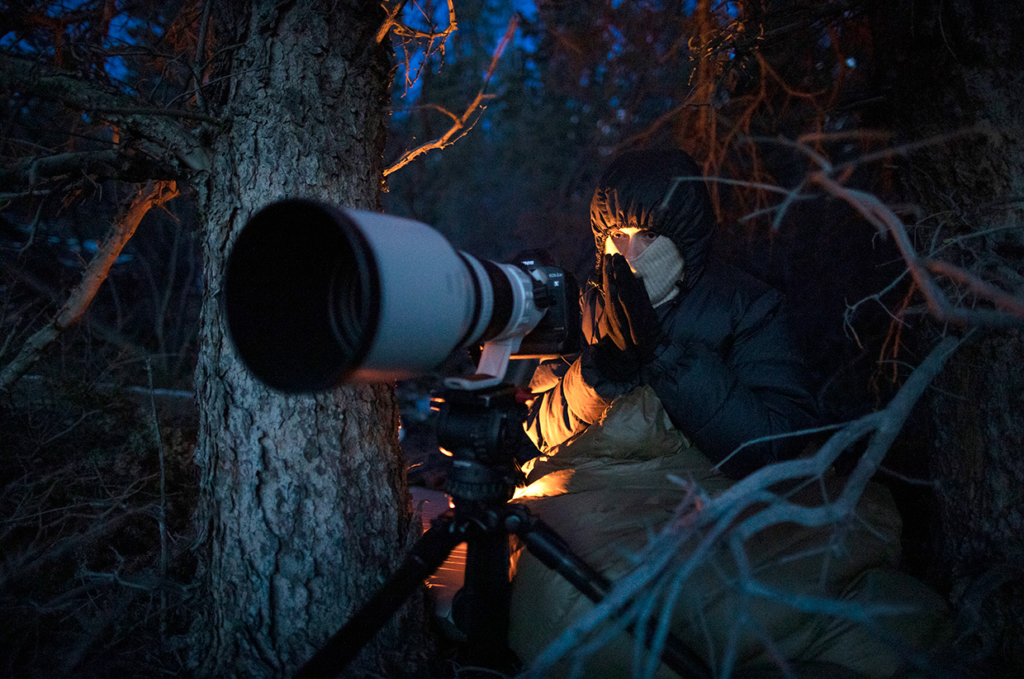 El objetivo de la fotografía de vida silvestre es desaparecer. Para ello, hay que esconderse, anticiparse al viento para que tu olor se aleje del animal. Hay que sentarse bajo un árbol sin pensar en el frío que hace en los pies ni en lo que vas a hacer dentro de una hora. Entonces verás a una ardilla saltando de una rama a otra. La naturaleza, tras haber aceptado tu presencia, retomará su curso normal. Ahora formas parte de ella. Y no hay nada más hermoso que ver pasar a un lobo o a un lince sin que te note.