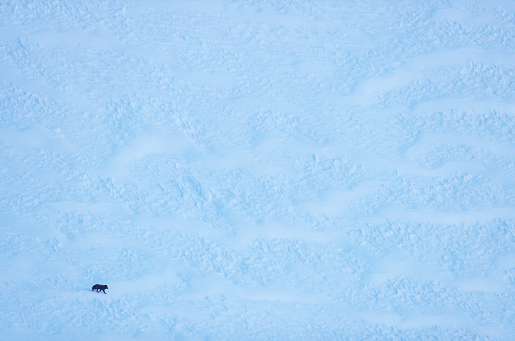 Ahora me concentro en la composición. Me olvido de que tengo frío. El blanco puro de todo, el blanco dentro del blanco que tanto tiempo he imaginado, abraza y amplifica el silencio. El fantasma de la montaña llena mi visor y trato de plasmar las experiencias y emociones de todas las semanas anteriores. El animal desaparece y reaparece en la ventisca, un espíritu etéreo pero animado. Tal como lo he visualizado durante tanto tiempo.